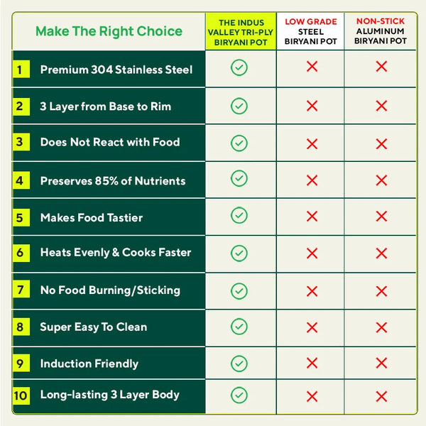 👌100% TOXIN-FREE: The Indus Valley's TurboCukTM Tri-ply Stainless Steel Cookware Combo: Kadhai/Kadai + Biryani Pot/ Casserole/ Stockpot/ Rice Cooking Pot is 100% toxin-free and food-safe. Truly healthier cookware combo than a nonstick set!
