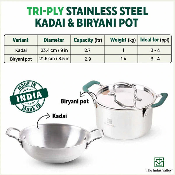 😎THE BEST CHOICE: Preparing healthy and tasty dishes will never be a problem with this tri-ply stainless steel combo. Browse the website to discover more amazing triply stainless steel cookware sets by The Indus Valley.