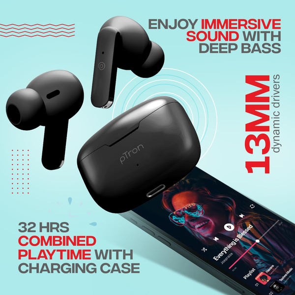 pTron Bassbuds Duo in-Ear Wireless Earbuds, Immersive Sound, 32Hrs Playtime, Clear Calls TWS Earbuds, Bluetooth V5.1 Headphone, Type-C Fast Charging, Voice Assist & IPX4 Water Resistant (Black Matt)