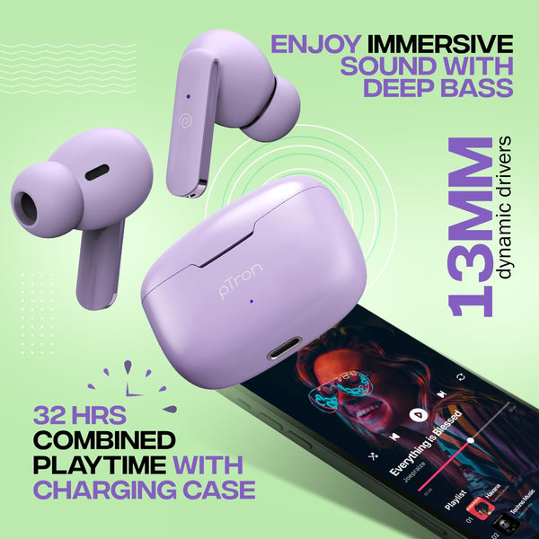 pTron Bassbuds Duo in-Ear Wireless Earbuds,Immersive Sound,32Hrs Playtime,Clear Calls TWS Earbuds,Bluetooth V5.1 Headphones,Type-C Fast Charging,Voice Assist&Ipx4 Water Resistant (Light Lilac)
