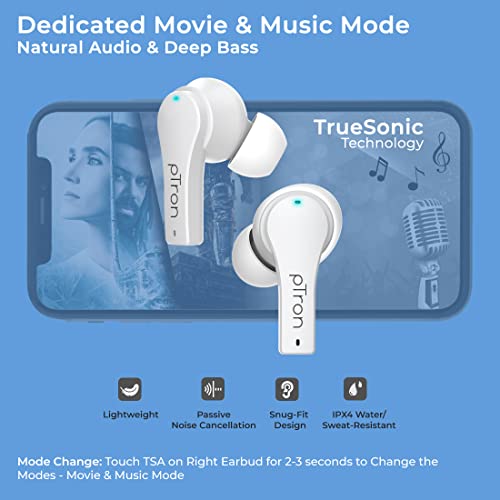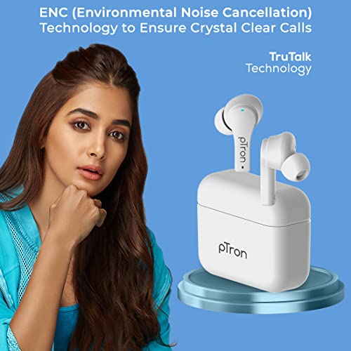 PTron Bassbuds Tango ENC Bluetooth Truly Wireless in Ear Earbuds with mic, Movie Mode, 40Hrs Playtime, Bluetooth Headphones 5.1, Deep Bass, Touch Control TWS Earbuds & Type-C Fast Charging (White)