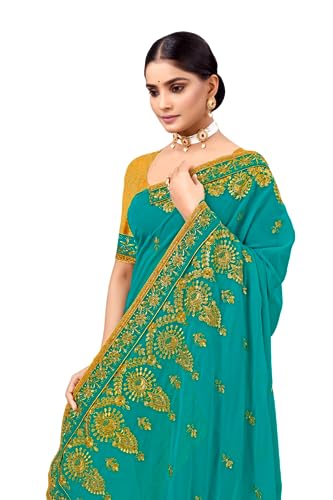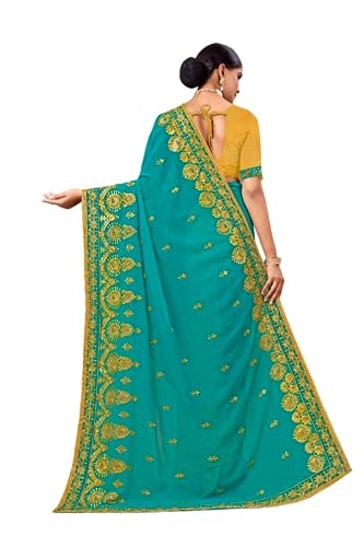 Radhe Radhey Women's New Net Embridered Sari With Unstitched Blouse (Free Size) (Firozi)
