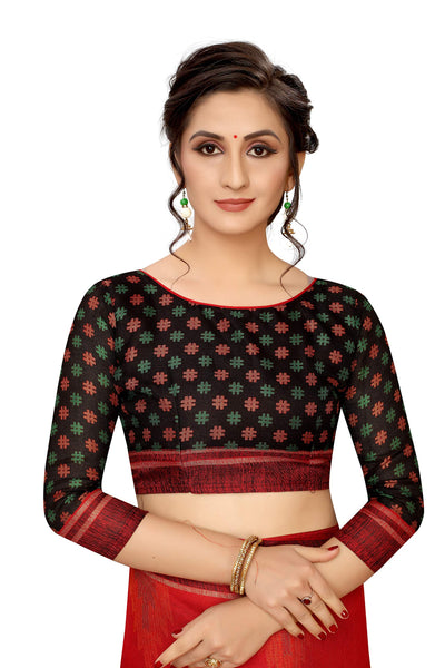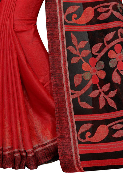 RAJESHWAR FASHION WITH RF Women's Soft Jute Printed Fancy Sarees For Women With Zari Border & Blouse(Red-Black_Free Size 6.30 Mtr)