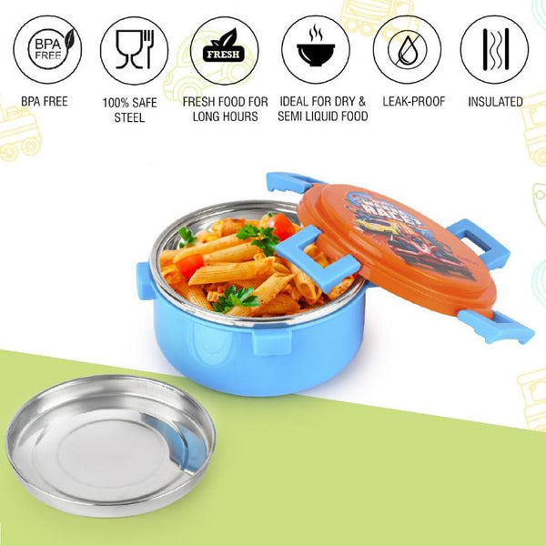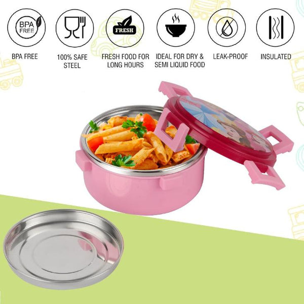Introducing the perfect lunchtime companion for kids - the Recess Insulated Lunch Box. Designed in a spacious round shape, this lunch box boasts a generous capacity while maintaining a lightweight profile. The charming pink, orange and red exteriors feature Hot Wheels, Spiderman and Disney Princess prints, adding a touch of fun to every meal. The side locks ensure a secure closure, preventing any spills or leaks during transportation. Inside, you'll find a high-quality stainless steel interior that's easy to clean. For the young ones who prefer variety in their meals, the included steel container separator plate lets you pack different foods without them mixing together. From sandwiches to snacks, fruits to veggies, this lunch box offers versatile storage options to suit every appetite. Whether it's a day at school, an outdoor adventure, a camping trip, or a delightful picnic, the Recess Insulated Lunch Box is the ideal companion.