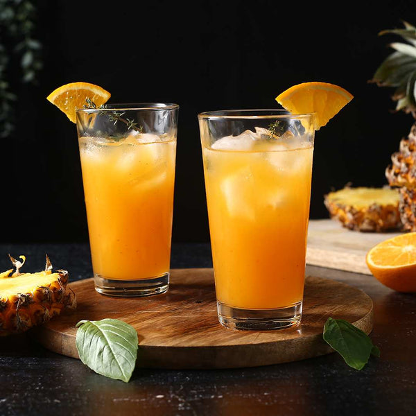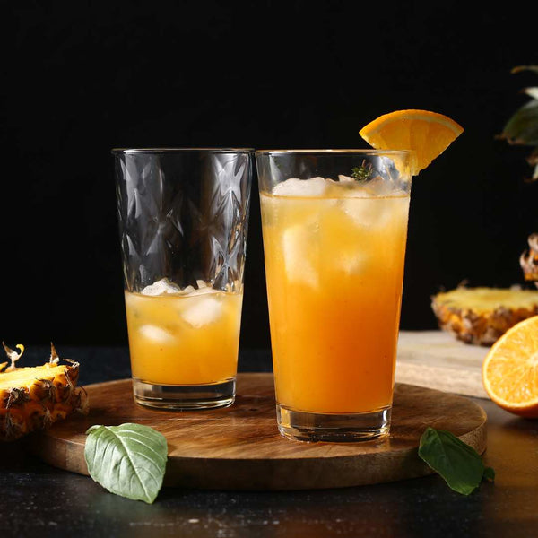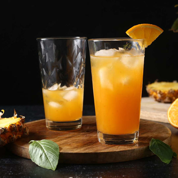 The Rosa drink glasses from Wonderchef combine playful details with simplicity in the spirit of modern casual chic. The diamond pattern decorating the glass creates a stunning reflection of light. It is suited for formal as well as semi-formal occasions. The set of 6 glasses is perfect to serve iced water, fresh drinks or even an interesting mocktail.Â