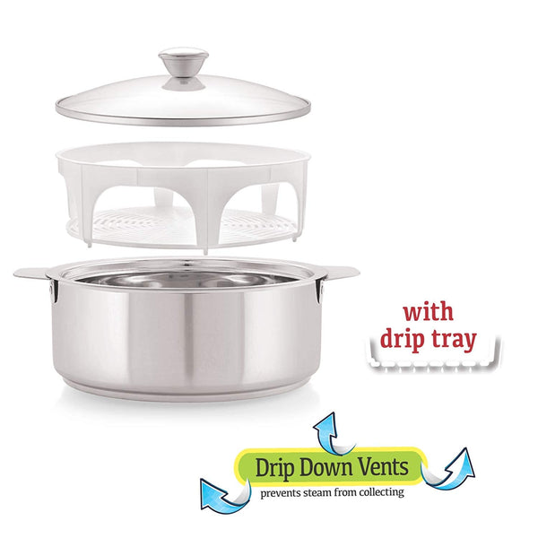 The Roti Plus Stainless Steel Casserole in a classic Silver finish offers a spacious and hygienic solution for your food storage and serving needs. This medium stainless steel casserole is designed to accommodate larger quantities of food with ease. Crafted from high-quality stainless steel, it not only ensures durability but also keeps your dishes hygienic and odorless. The added convenience of being dishwasher safe simplifies cleanup. Additionally, it comes equipped with a see-through tempered glass lid, allowing you to monitor your cooking without losing heat or flavor. With the Roti Plus Stainless Steel Casserole, you have a reliable and practical addition to your kitchen that enhances both your cooking and serving experience.