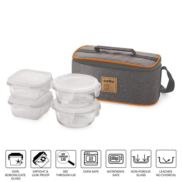 Introducing the Royale Borosilicate Glass Lunch Box with Jacket, a set of four exquisite glass lunch boxes that combine elegance with practicality. These clear glass lunch containers offer a stylish and functional solution for your meal storage needs.