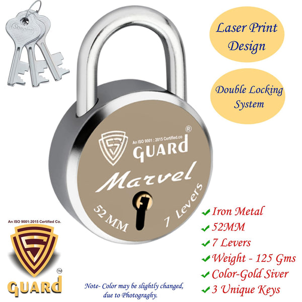 S-GUARD Locks, Padlocks, Door Locks 52MM- 7 Levers, Double Locking-Laser Print-Silver-Gold, Iron Padlocks, Locks and Keys-Pack of 5 (MARVEL-52MM)