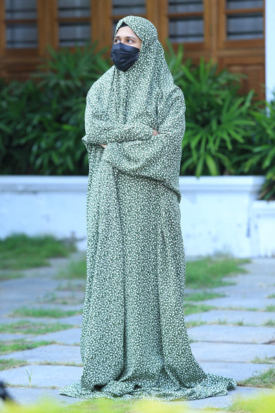 This is single piece prayer dress in textured crepe fabric, which gives you most comfort and cool while praying. It has 80 inches length and 5XL width.