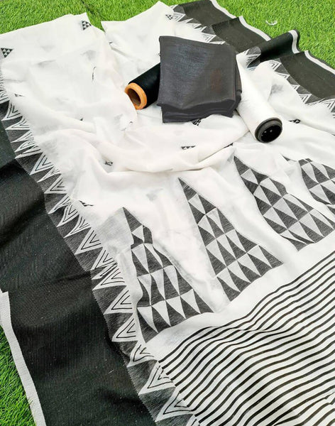SIRIL Women's Cotton Silk Jamdani Jacquard Saree With Unstitched Blouse Piece (3684S132_White Black)