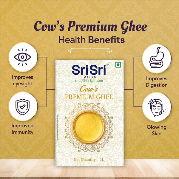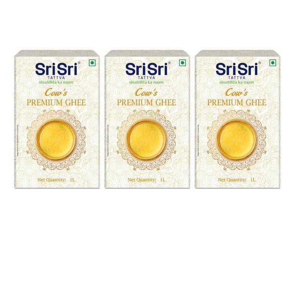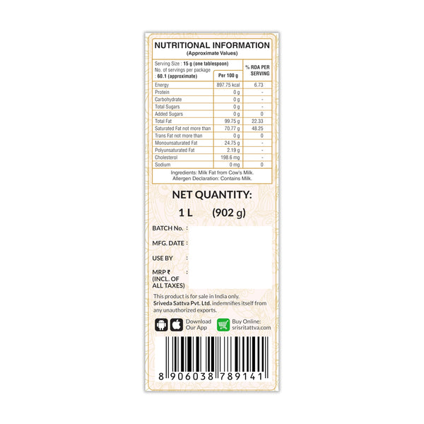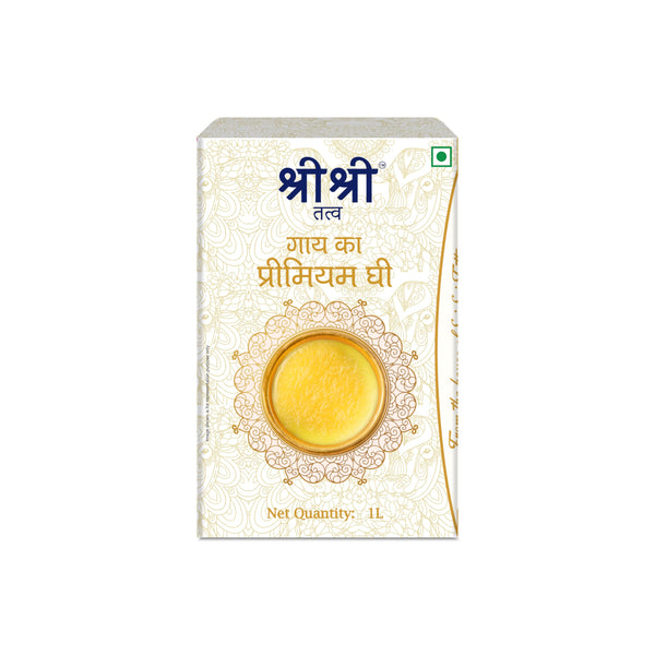 Details: Sri Sri Tattva's premium cow ghee embodies purity, heritage, and health. Our 1-liter jar of pure desi ghee is high in vitamins, antioxidants, and good fats; it nourishes the body, aids digestion, and improves overall health. The ghee offers the spirit of classic deliciousness to your life, whether you use it for cooking, adding over your favorite foods, or even in your daily rituals. This premium cow ghee a sign of purity and authenticity. Our ghee is prepared from churned butter, giving it an unrivaled flavor and texture. With Sri Sri Tattva, you may elevate your cooking experience and enjoy the purity of Cow's Premium Ghee.
