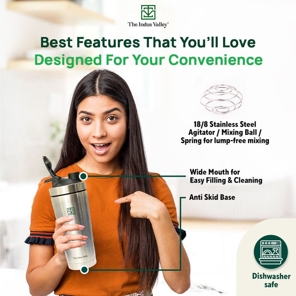 The Indus Valley Vacuum Insulated Stainless Steel Protein Shaker (750 ml) with Steel Agitator is 100% food-safe and toxin-free.