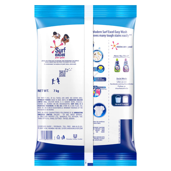 Details: Introducing Surf Excel Easy Wash Detergent Powder, a revolutionary laundry solution designed to make your laundry experience a breeze. Harnessing the power of 10 hands on tough stains, this engineered formula and superior technology ensure a thorough cleansing that effectively removes all types of stains. Surf Excel firmly believes that tackling dirt is synonymous with unlocking human potential, and since its inception, the brand has been dedicated to enhancing the way we approach laundry. Surf Excel Easy Wash Washing Powder boasts a 100% stain removal guarantee, effortlessly tackling everything from stubborn ketchup stains and mud blemishes to pesky food spills and persistent paint spots. Experience the freshness and spotlessness that only Surf Excel can deliver. Not only does it eradicate tough stains, but it also preserves the original color of your fabrics, ensuring that your clothes look as good as new after every wash. With Surf Excel, laundry becomes a seamless and efficient process, allowing you to focus on what truly matters. Say goodbye to the hassle of stubborn stains, and embrace the ease and effectiveness of Surf Excel Easy Wash Detergent Powder – the expert choice in laundry care. Unleash the power of 10 hands and elevate your laundry experience with Surf Excel.