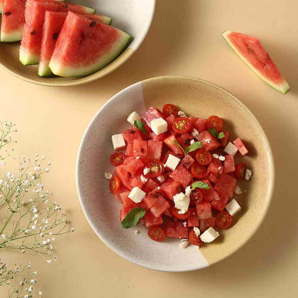 Teramo collection of premium stoneware is inspired by earthy tones and is a true blend of traditional craft with contemporary forms. This flat bowl in half-n-half tones of yellow and beige is fashionable yet rustic for your dinner table. The Flat Bowl as the name suggests, comes with depth that makes it the ideal choice to serve pasta and salads in it.