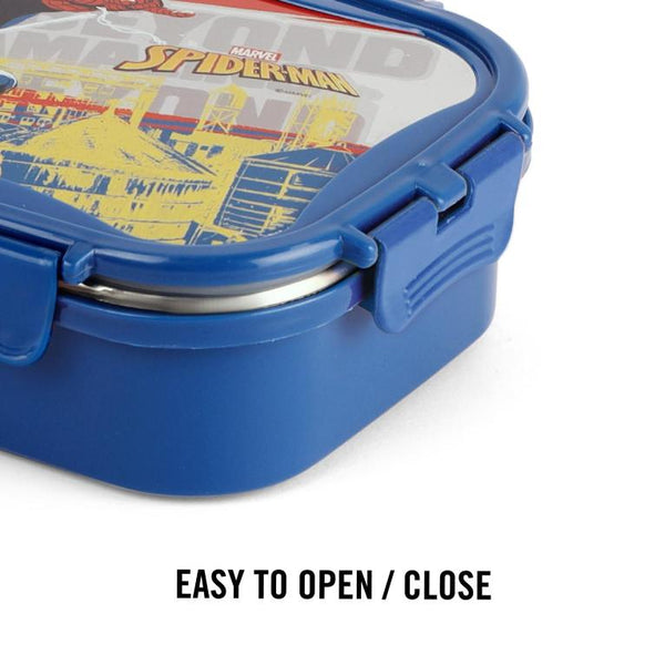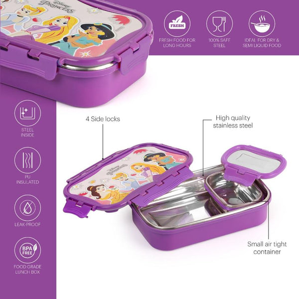 Introducing the Cello Kidzbee Thermo Click Toons Insulated Lunch Box – a dynamic mealtime companion for kids! A compact lunch box with kiddie prints, durable stainless steel material, and vivid colours that is perfect for school, picnics, and camping. The lightweight design fits easily in backpacks, while side locks and an airtight lid keep food fresh and secure. Inside, a leakproof steel container accommodates gravies and snacks. Stylish, functional, and safe, the Cello Kidzbee Thermo Click Toons Lunch Box comes in Red, Blue, Pink and Violet with Disney Princesses and Spiderman making lunchtime exciting for every child.