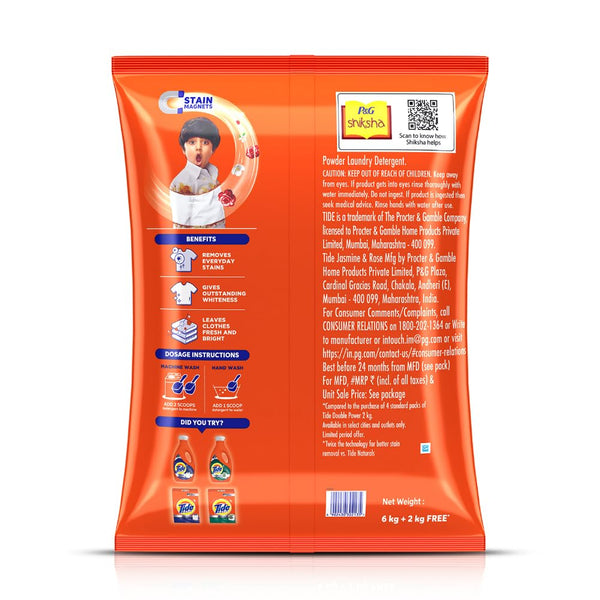 Details: New Tide Plus Double Power detergent powder has Stain Magnets, which can remove the toughest of stains to give you STAINLESS WHITES. Tide Plus' improved formulation and enzyme system has been specially designed to beat tough kitchen stains and give you outstanding whiteness. We often get food stains while cooking, when kids eat, while spending time with family. Tide Plus Double Power has easy dissolution in water and great foaming properties which removes stains easily. It is available in a range of amazing iconic fragrances - Jasmine&Rose and Lemon&Mint. The product works on both white and coloured clothes. Tide's Double Power refers to the superior formulation vs. Tide Naturals. Tide, a unit of Procter and Gamble, is the World’s Oldest and Most Trusted Detergent brand and is the Market Leader in 23 Countries around the world.