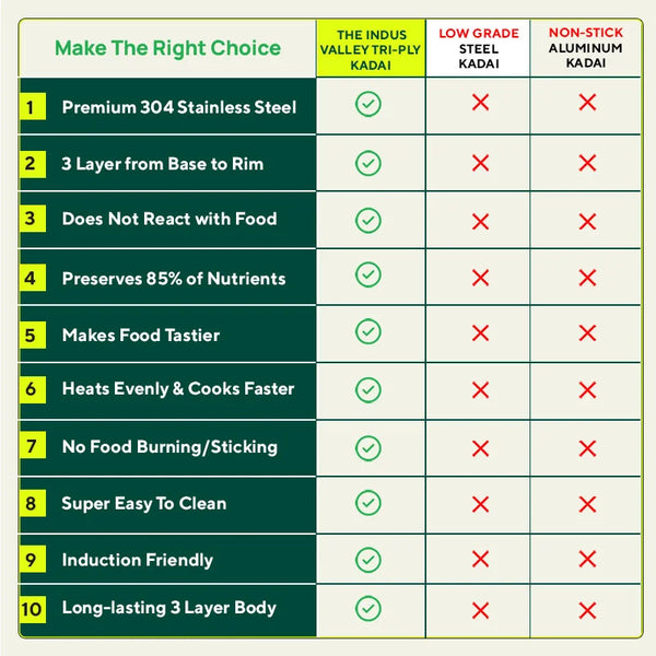 💪100% TOXIN-FREE: The Indus Valley’s TurboCukTM Tri-ply Premium Stainless Steel Kadai/Kadhai with glass lid is 100% food-safe and without any chemical coatings.