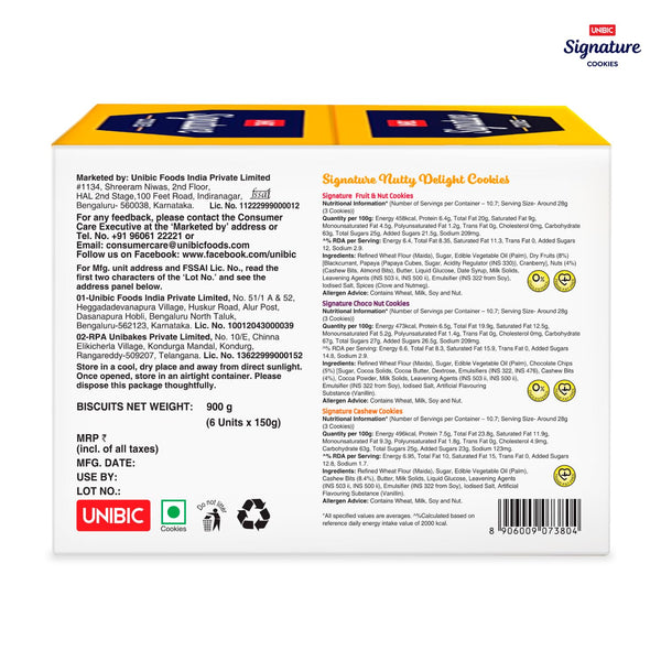 Indulge in Unibic's Signature Collection Cookies, featuring a delectable Nutty Delight Combo of Cashew Nut, Choco Nut, and Fruit & Nut Cookies. These bakery-fresh cookies are perfect for snacking anytime, while their single-use packets make them ideal for on-the-go. Made from 100% organic ingredients, these cookies are a guilt-free treat for your whole family.