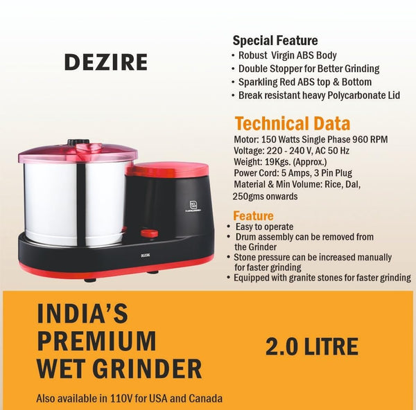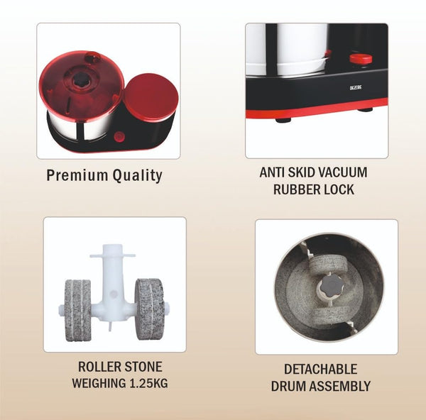 Details: The VIJAYALAKSHMI DEZIRE Table Top WET Grinder is the perfect addition to your kitchen. Its compact design takes up minimal space, and its ABS plastic body makes it shockproof and heat-resistant. With a capacity of 2 liters, this grinder features two roller stone set assemblies and a cylinder that can create soft and smooth tiffins in just 20 minutes. In addition, the grinder comes with an Atta kneader and a coconut scraper, making kitchen tasks even easier. Don't settle for anything less than the best - get the VIJAYALAKSHMI DEZIRE Table Top WET Grinder for your kitchen today!