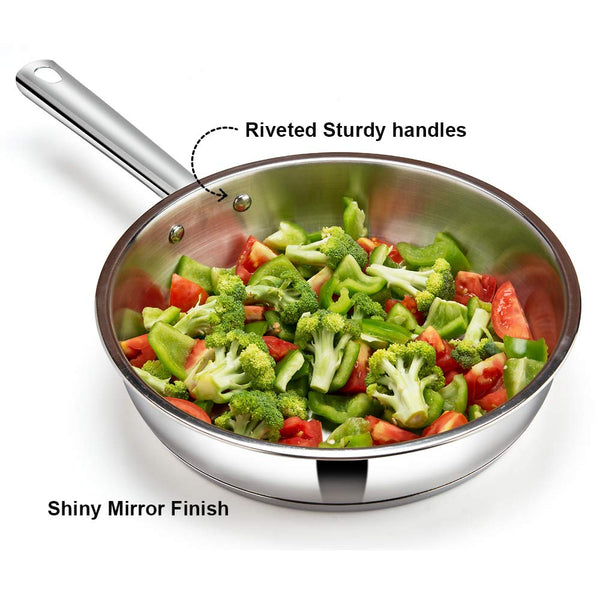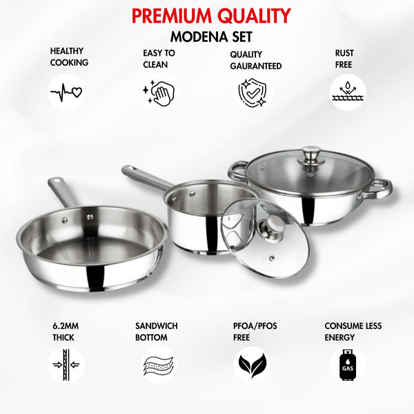 Details: Vinodβs 3 pc Modena stainless stainless induction based cookware is GO TO set for all your meals, whether it is to boil Milk for breakfast in 1.5ltr saucepan that comes with glass lid or cook your favourite lunch in 2.8ltr Kadai with glass lid or simply toss a aloo tikki or eggs for your evening snack in our 24cm frypan.They are made from food grade high quality stainless steel using thicker stainless steel for longer use. To ensure you uniform and faster cooking we have used a layer of aluminium at the bottom. We use a base of stainless steel of Grade AISI 430 grade. This is magnetic and allows you to use your induction cooktop.The mirror finish of the body and the stainless steel layer at the bottom stays bright, and looks as good as new after years of use. It also makes the saucepot easy to clean and hassle free. They come with riveted stay cool handles which allow you to work with them effortlessly.