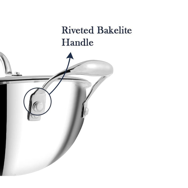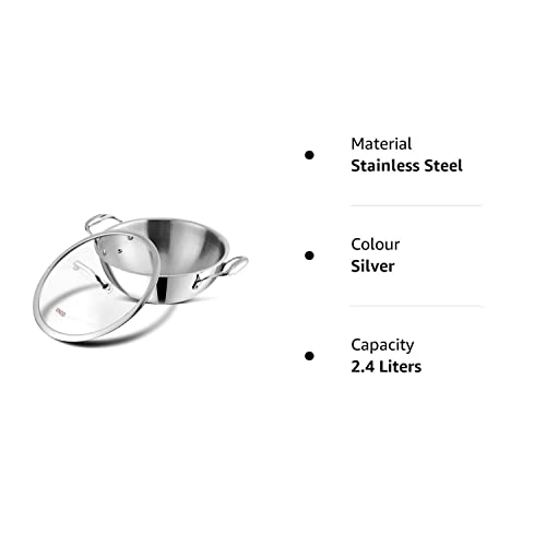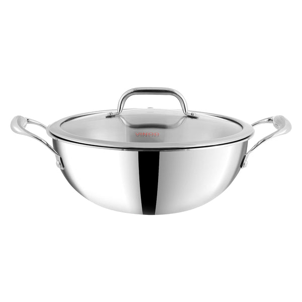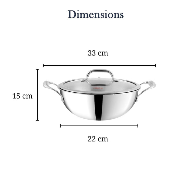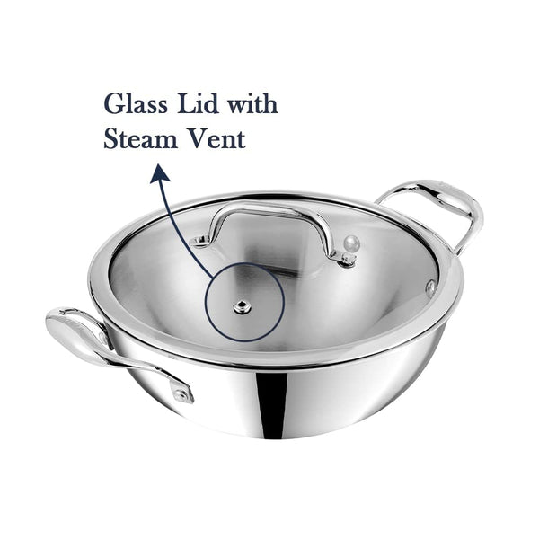 Vinod Platinum Triply Stainless Steel Extra Deep Kadai with Glass Lid 2.5 litre (22 cm) | 2.5mm Thick | Kadai for Cooking | Heavy Base | Induction & Gas Base | 5 Year Warranty