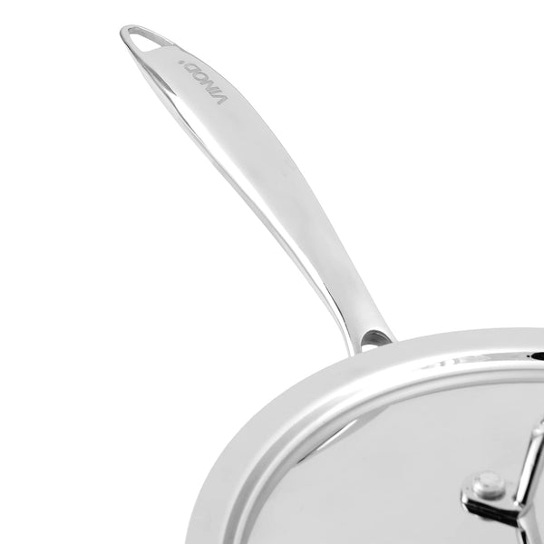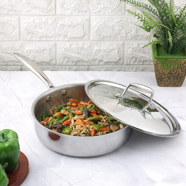 Vinodβs Saute pan is made of premium stainless steel material (18/8) Grade to make your sautΓ©ing moment hygienic and stress free. It is made with SAS Technology that is 3 Layer technology, wherein 3 layers are as below: Stainless Steel β Aluminium- Stainless Steel. The Layers: Evenly constructed to ensure that heat is distributed evenly throughout during the cooking process and not to a selective spots of the pan. Handle: To enhance your cooking experience, The Handle of this pan is riveted to make it extra strong & is ergonomically designed to ensure a firm grip while dealing with the pan the middle layer is consists of aluminium throughout, this ensures in even heat distribution and uniform cooking of food. The third layer is made of 430 stainless steel for induction compatibility. This triply stainless steel frypan comes with riveted stainless steel handle that is ergonomically designed, provides maximum durability and extreme comfort. It is compatible across all heating platforms like gas, induction, ceramic, infrared and hotplate. Make wholesome nutritious healthy dishes including stir fried vegetables, omelette, gravies, pancakes, fish fries and much more.