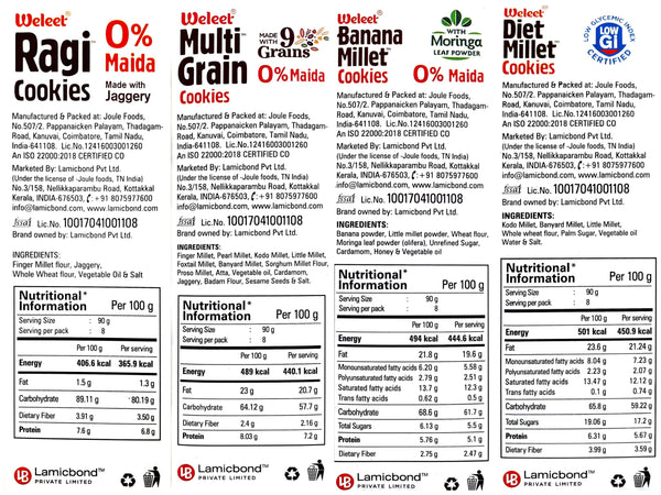 Weleet Assorted Pack Of Multi Grain, Millet, Ragi & Banana Millet Digestive Cookies|Home/Office Snack|Free Of White Sugar & White Flour|100% Natural & Healthy (4 Flavours-360 Gm)