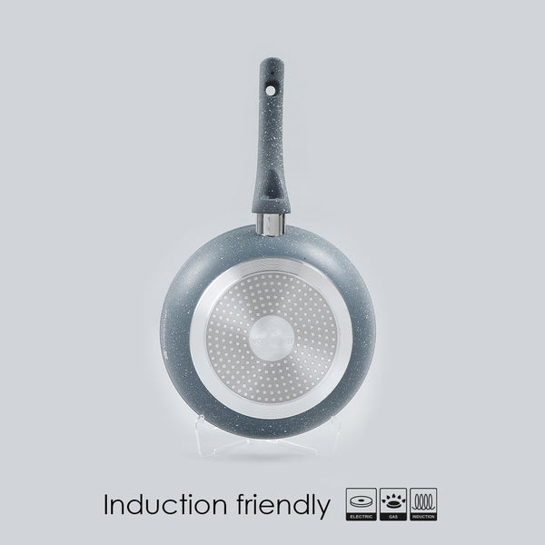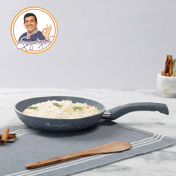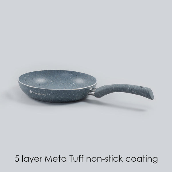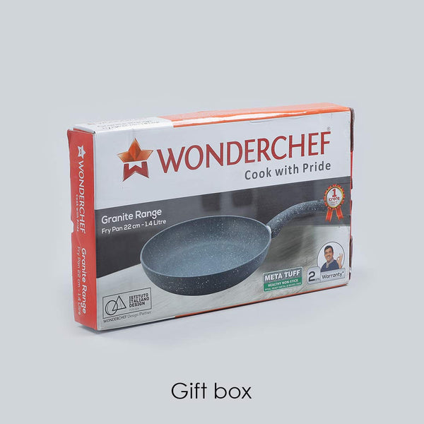 A. Wonderchef Granite Fry Pan is a designer forged pan made with pure grade virgin aluminium for quick and even heat distribution. It is strong and long lasting with 3.5mm thickness. It is ideal for everyday cooking and needs no oil or very less oil to cook. It is a perfect solution to cook healthy, low fat and delicious meals at home. The long handle is ergonomic and gives a comfortable secure grip. Ergonomically designed soft touch handles and knob that do not heat up during cooking. It is 100% PFOA free, heavy metal and nickel free for your safety and has a health-friendly 5 layer Meta Tuff non-stick coating for daily use.