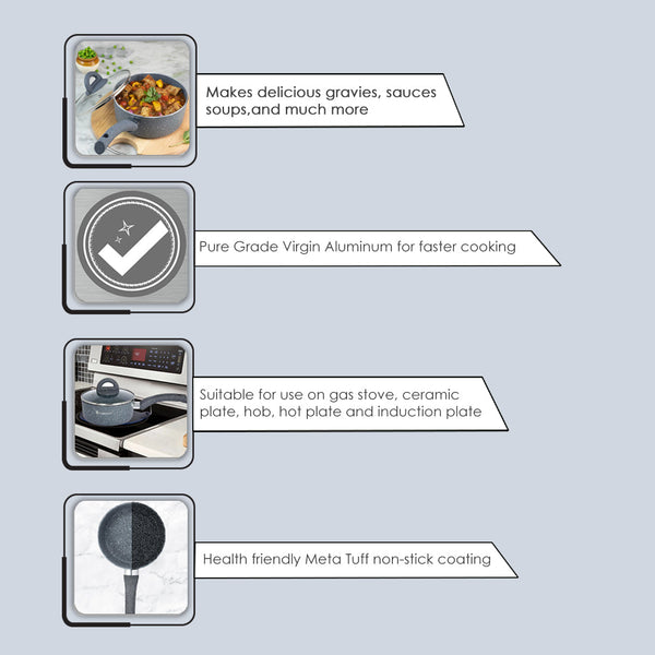A. Wonderchef Granite Saucepan is a designer forged pan made with pure grade virgin aluminium for quick and even heat distribution. It is strong and long-lasting with 3.5mm thickness. It is ideal for everyday cooking and is a perfect solution to cook healthy, low fat and delicious meals at home. The long handle is ergonomic and gives a comfortable secure grip. Ergonomically designed soft-touch handles and knob that do not heat up during cooking. It is 100% PFOA free, heavy metal and nickel free for your safety and has a health-friendly 5 layer Meta Tuff non-stick coating for daily use.