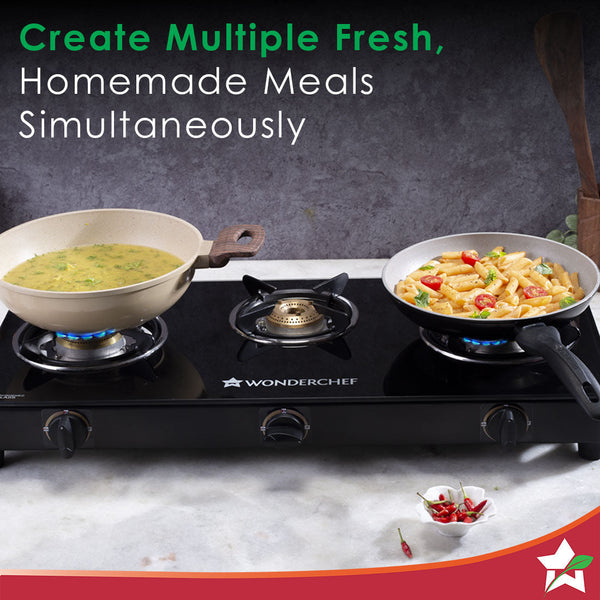 Ultima 3 Burner Manual Glass Cooktop | 6mm Toughened Glass Cooktop | Stainless Steel Drip tray | Anti-Skid Legs | Large Pan support | Manual Ignition | 360 degree Revolving Nozzle | Black steel frame | 2 Year Warranty | Black