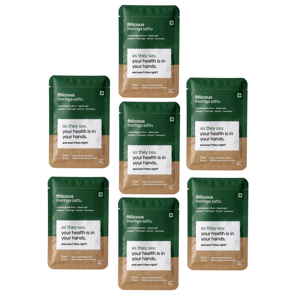 Fitlicious Sattu Powder - Gluten-Free Roasted Gram Flour, Moringa Sattu Fiber-Rich Sattu Drink Powder (Pack of 7, 40g Each)
