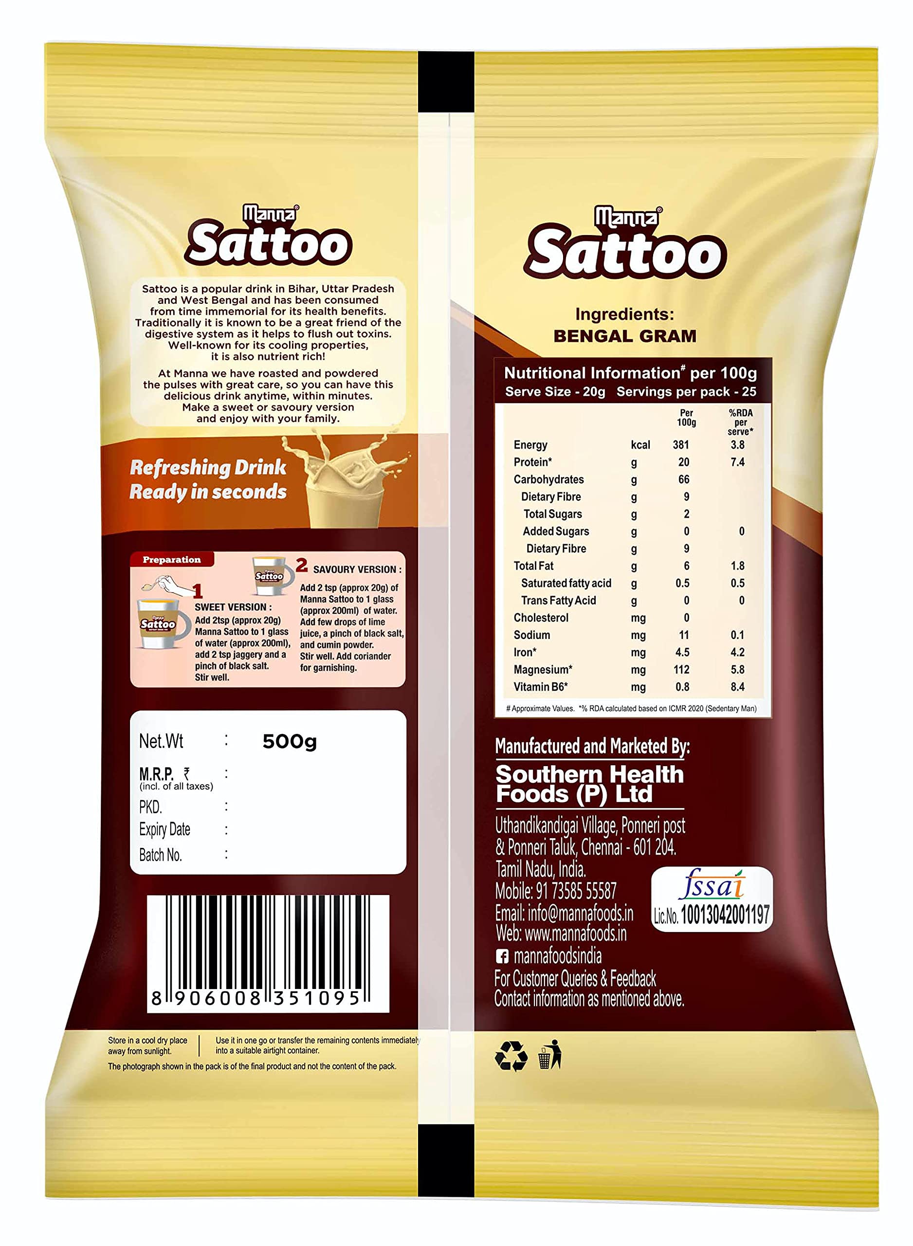 Manna Sattu Atta 1Kg 100% Channa Sattu Roasted Gram Atta Flour (500 X 2 Packs)
