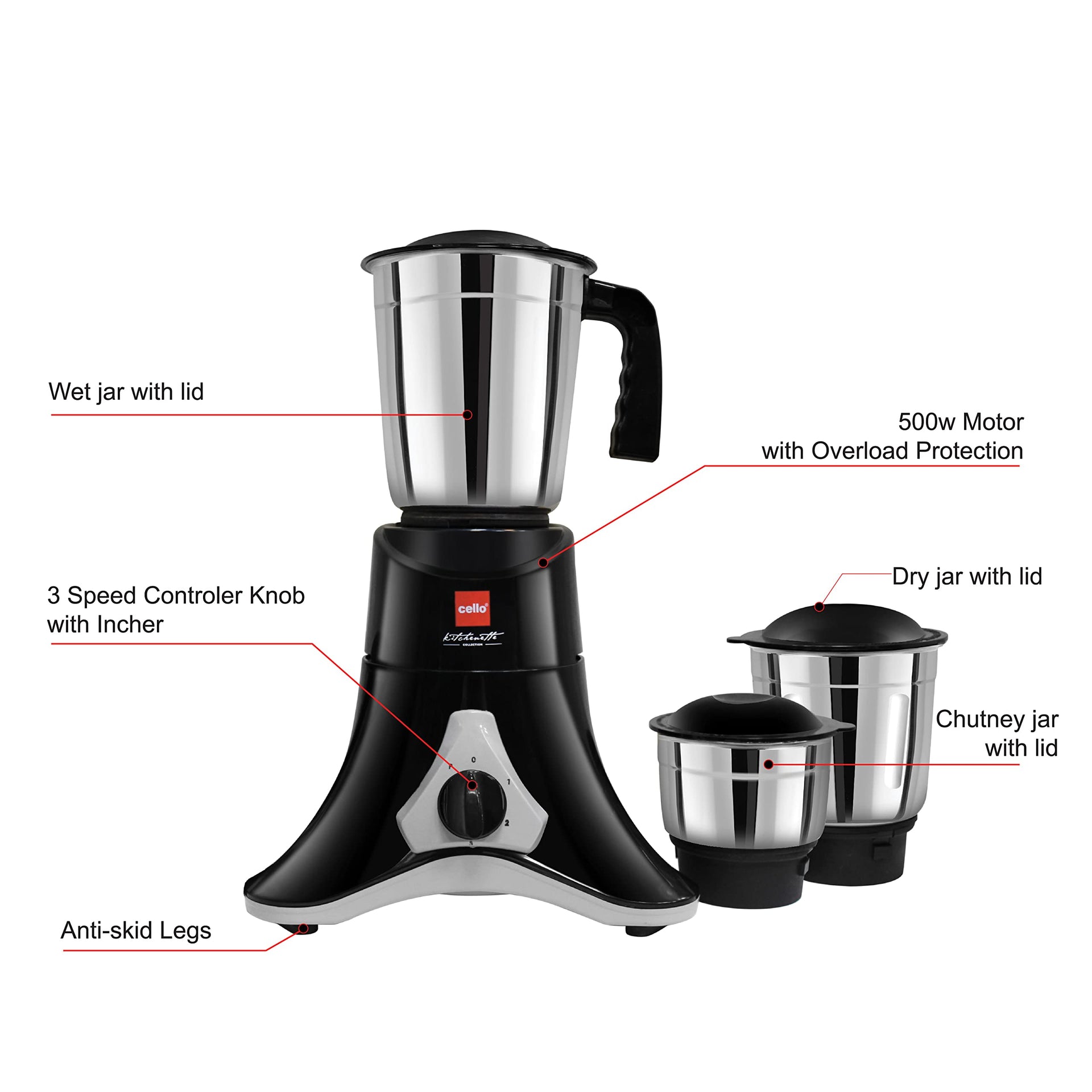 Cello Crown Grind-N-Mix Mixer Grinder 500Watt with 3 Stainless Steel Jars, Black