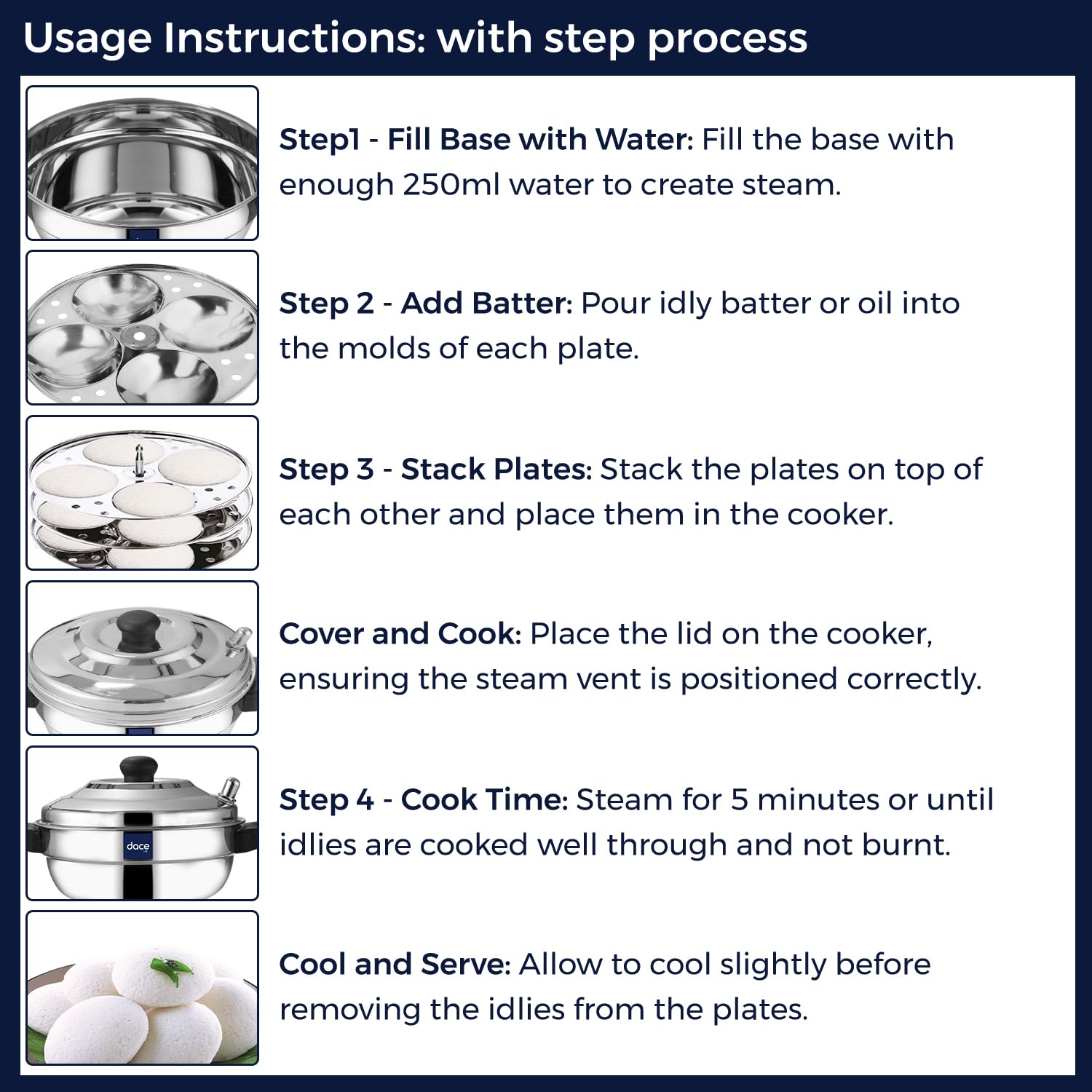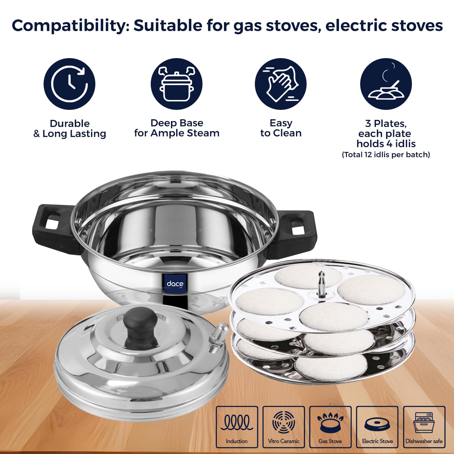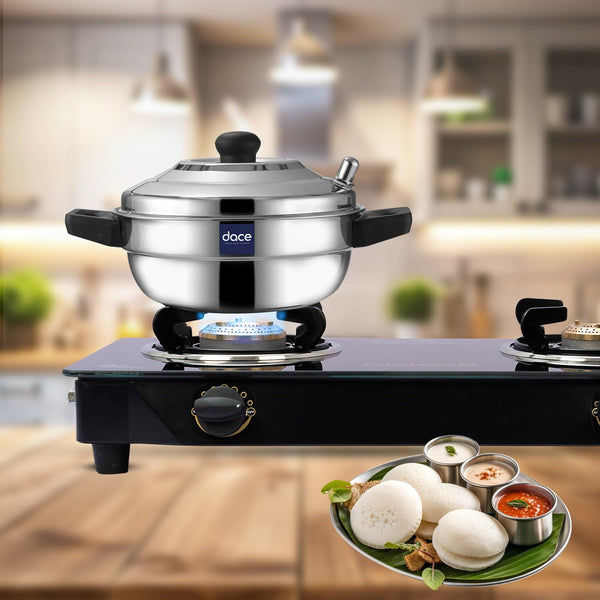 DACE Lite 3 Plate Ss Idli Cooker With Whistle Indicator | Idli Cooker Stainless Steel Pot Steamer| Steel Idli Maker With Silver Lid- 3 Plates- 12 Idlies, 0.5 Litre