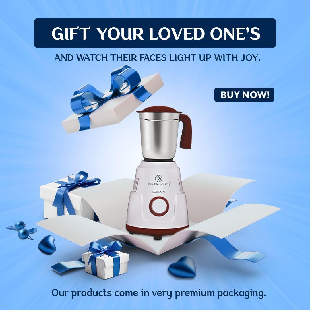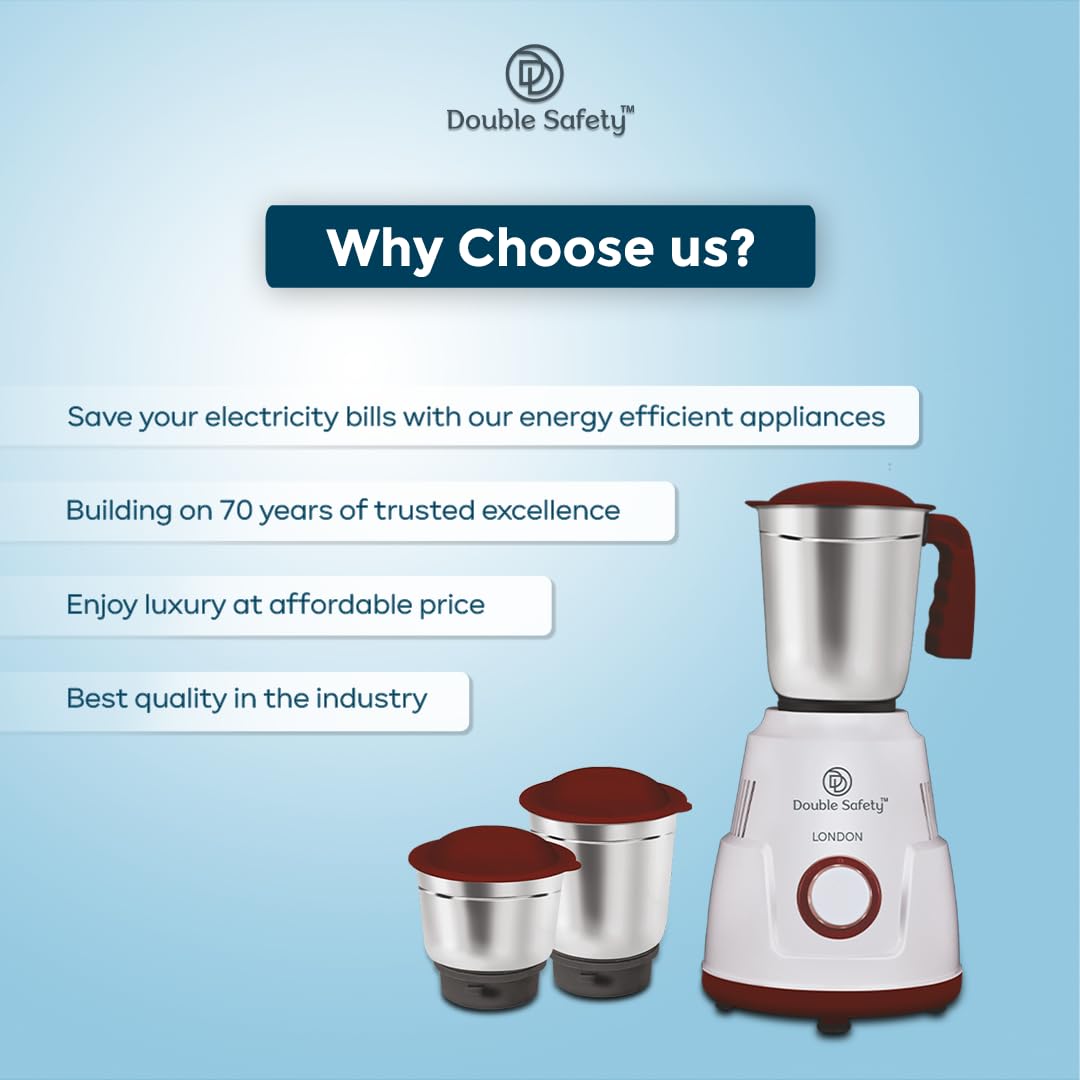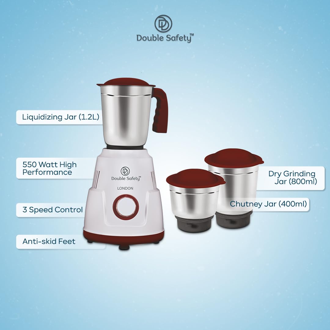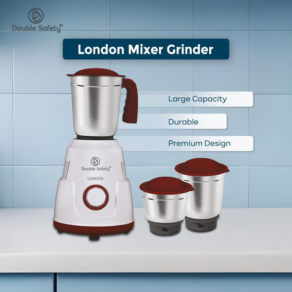 Double safety London Mixer Grinder 550 watts | 3 Stainless Steel Jars | Chutney Jar, Dry Grinding and Liquidizing jar to make chutneys, Milkshake, Smoothies, Puree | High Speed