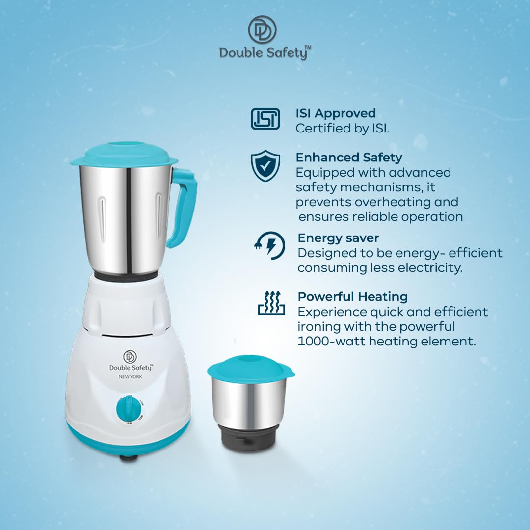 Double safety New York Mixer Grinder 500 watts | Chutney Jar and Liquidizing jar to make chutneys, Milkshake, Smoothies, Puree | High Speed | Superior Mixi for Kitchen | Stainless Steel Jars
