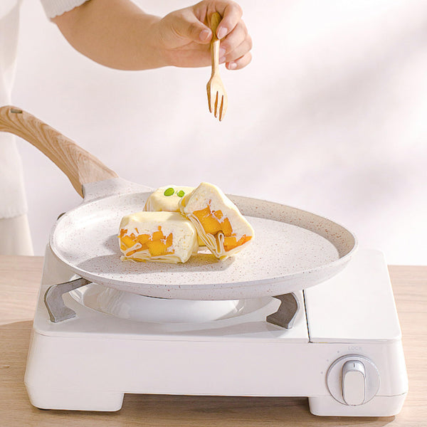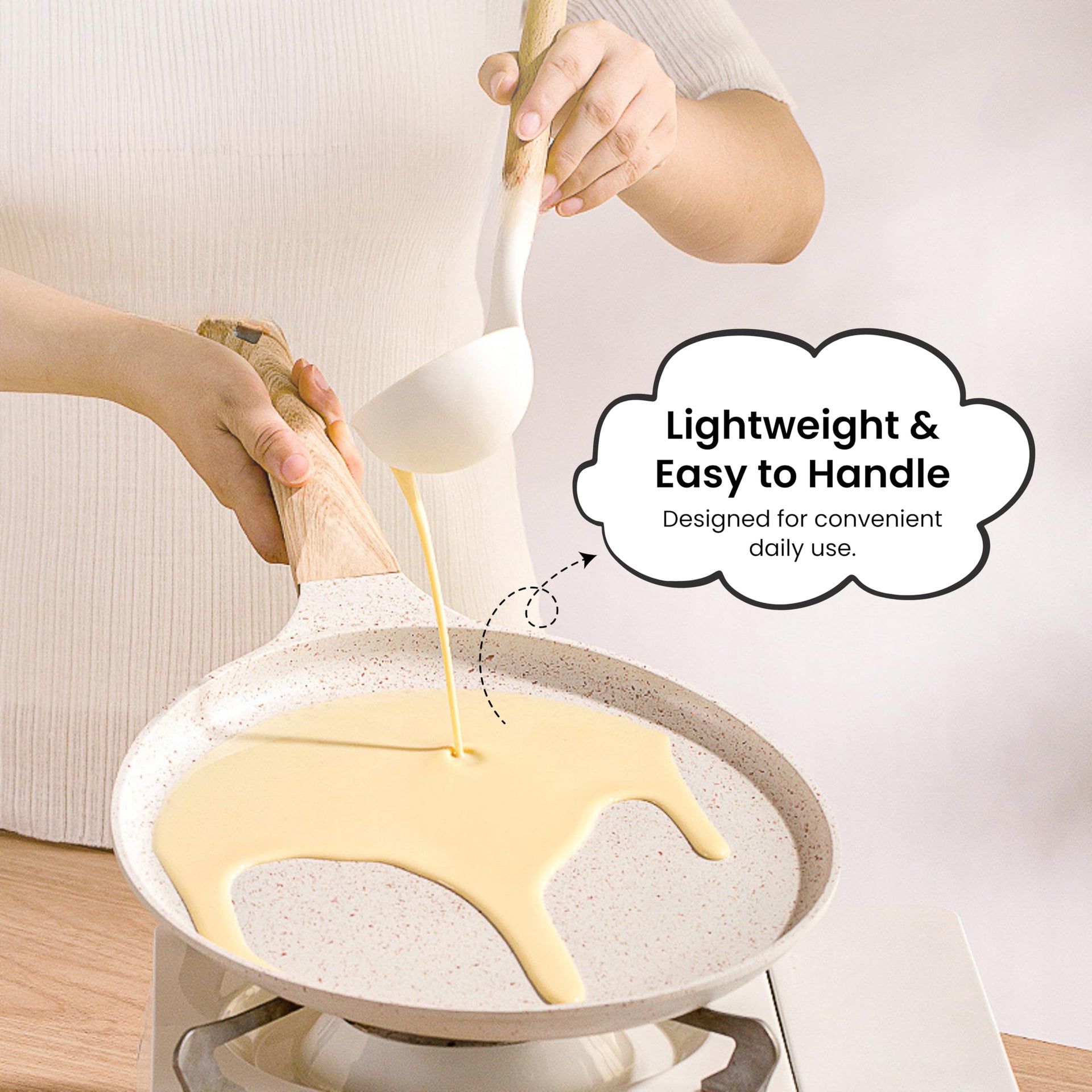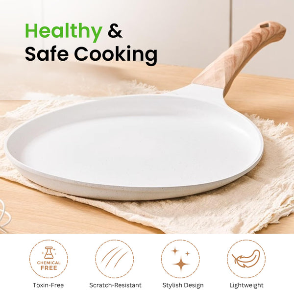HomeEssentials Maifan Nonstick Tawa – Healthy Nonstick Pan with Wooden Handle/Easy to Clean Cooking Pan for Dosa, Chapati, Pancakes & Omelets/Induction & Gas Stove (White)