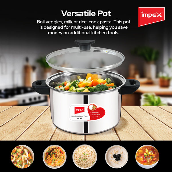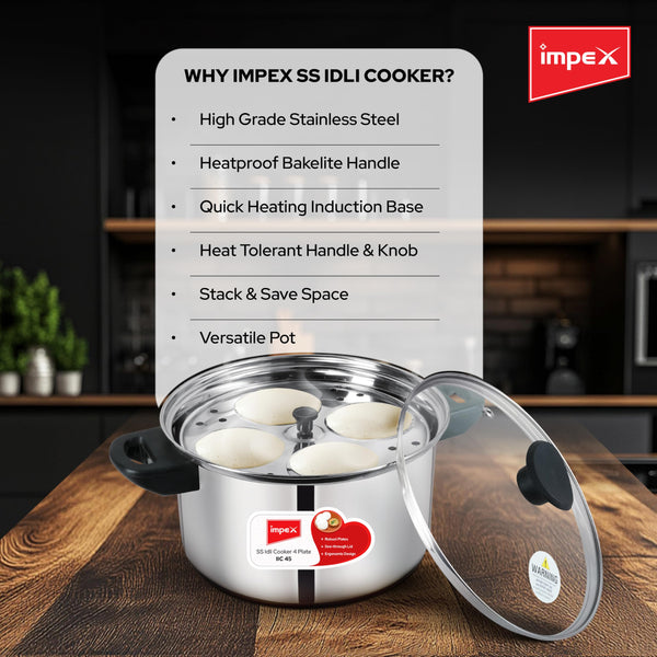 Impex Stainless Steel Idli Cooker With Glass Lid | Induction and Gas Stove Competable Idli Maker | 4.5L Idly Cooker with 4 Plates | 1 year Warranty