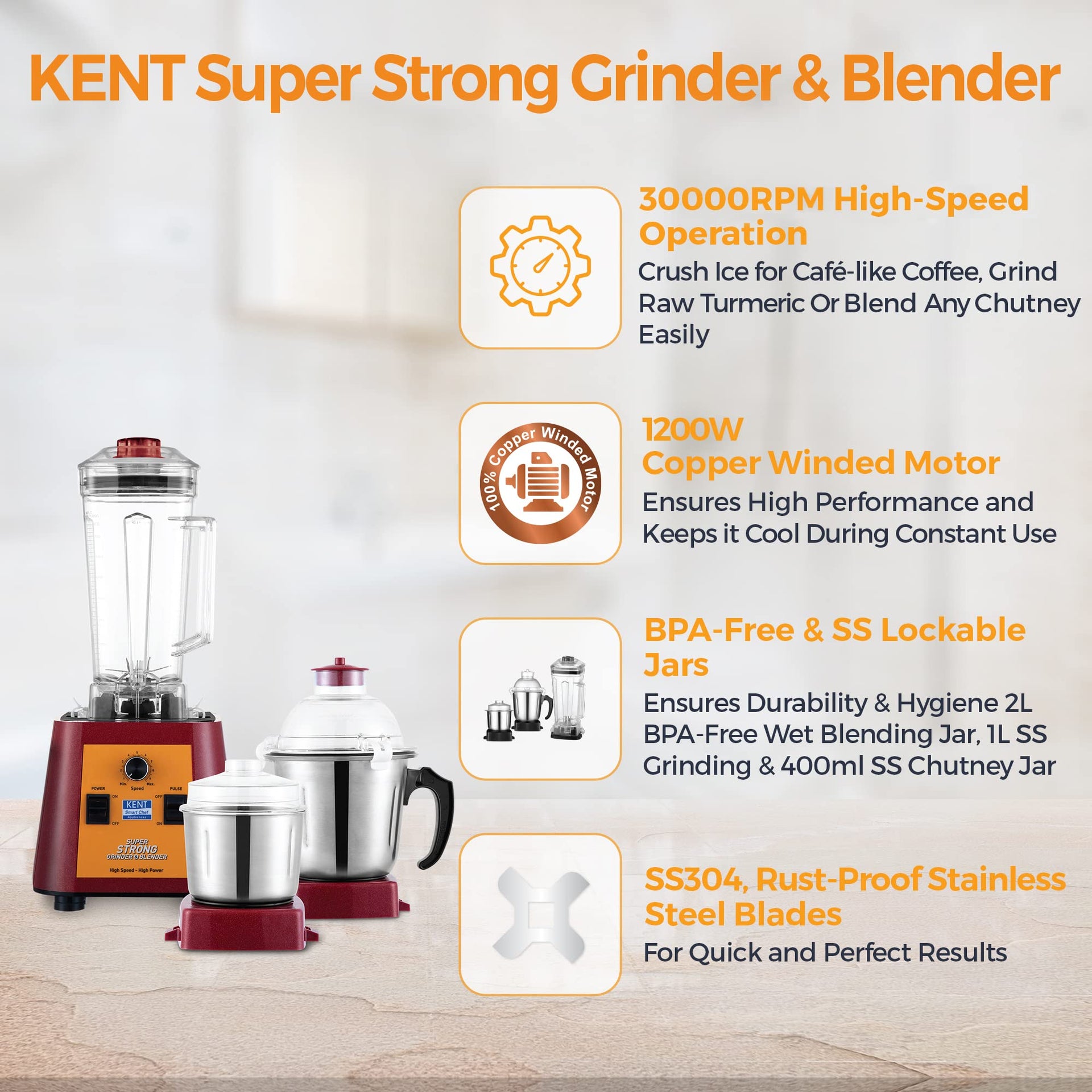 KENT Stainless Steel Super Strong Grinder&Blender|30,000 Rpm Electronic Variables Speed Control|Spill-Proof Lids With Jars|Overheating&Overcurrent Protection|Lockable Jar|Speed Control Switch