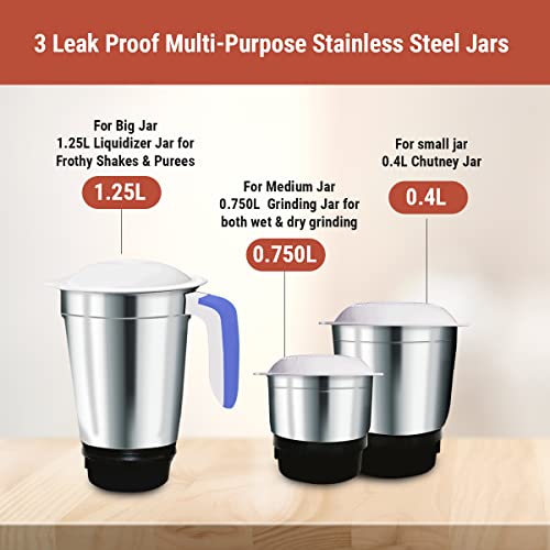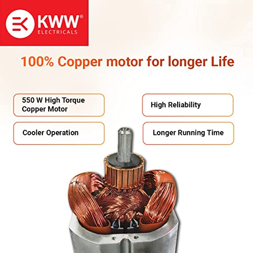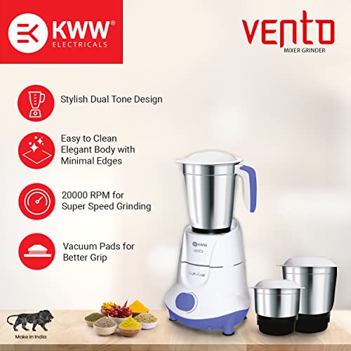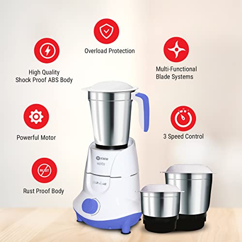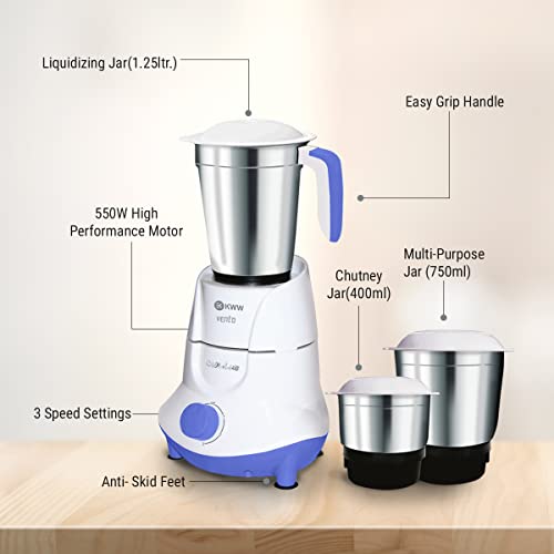 KWW Vento 3 Jar Mixer Grinder 550 Watt | 3 Stainless Steel Jars with Auto Overloading Protection | ISI Certified Shock Proof Body | 2 Years Warranty | Quick cool ventilation (White & Blue)