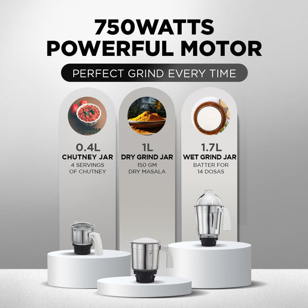 Preethi Popular Mixer Grinder for Kitchen | 750-Watt L-shaped Mixie, 3 jars | 5yr Motor Warranty & Lifelong Free Service| White (MG 142)