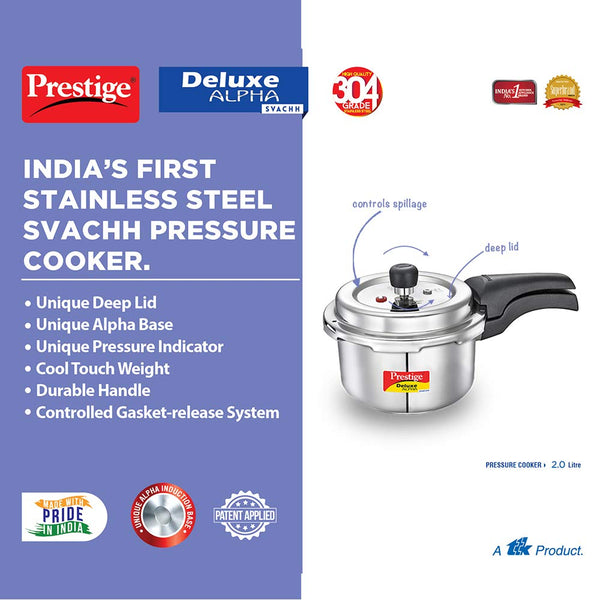 Prestige Svachh Deluxe Alpha 2.0 Litre Stainless Steel Outer Lid Pressure Cookers, Silver, 2 Liter