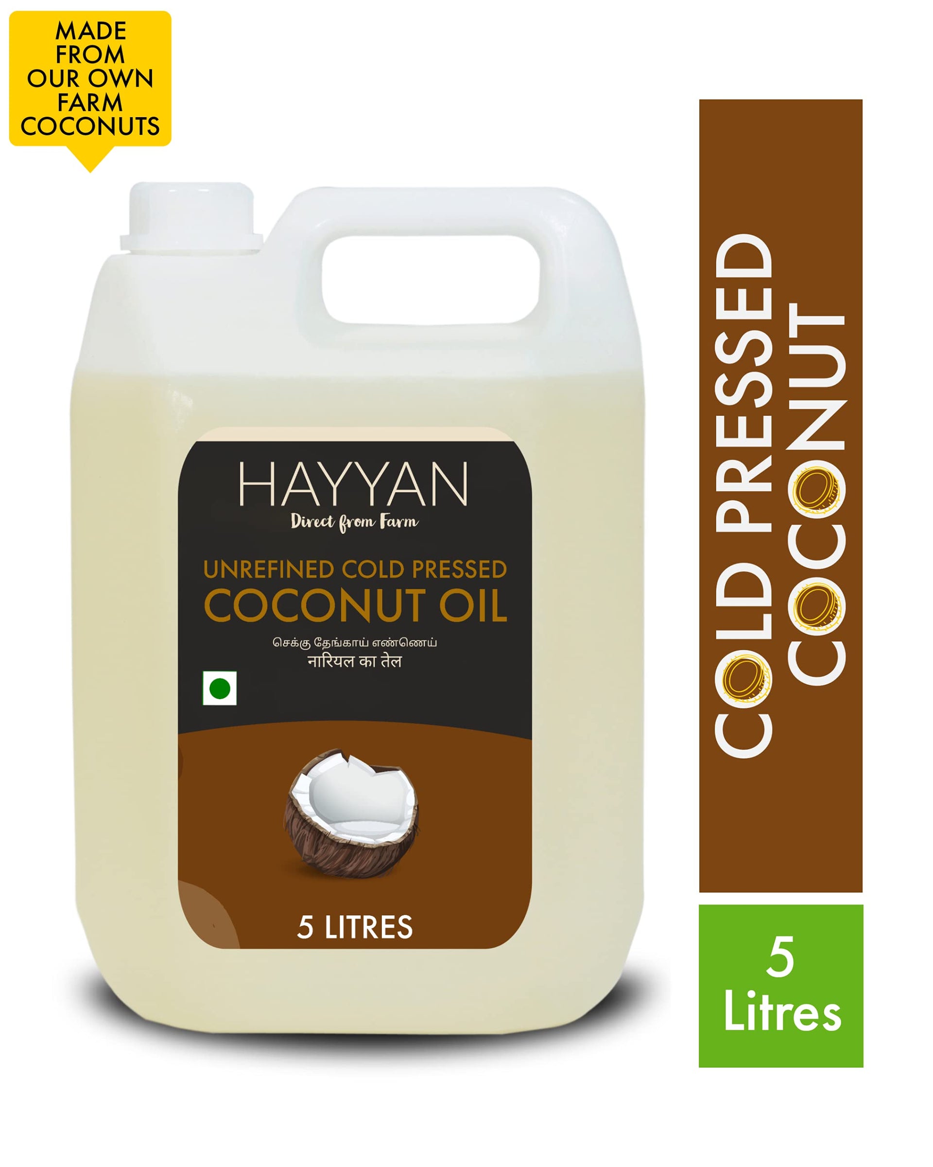 HAYYAN Cold Pressed Coconut Oil - Own Farm Unrefined for Cooking, Skin, Hair & Baby massage (Chekku/Ghani) - 5 Litres
