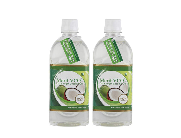 Merit Vco Extra Virgin Coconut Oil - Pack of 2 (500 Ml Each) | 100% Pure, Edible Grade | For Cooking, Skin & Hair Health, Oil Pulling
