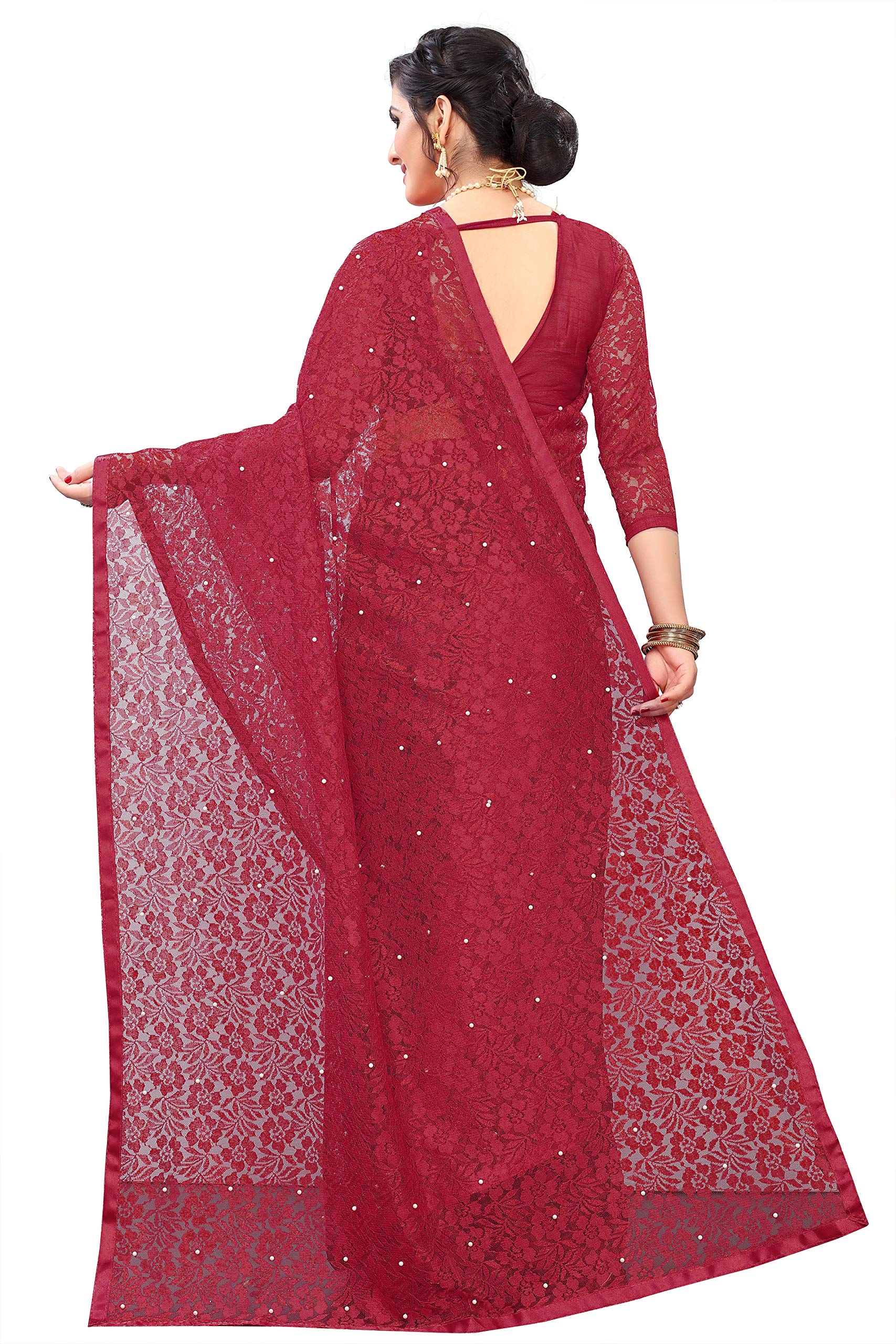 LOROFY Women's Net Saree (With Blouse_Free Size) (Maroon)