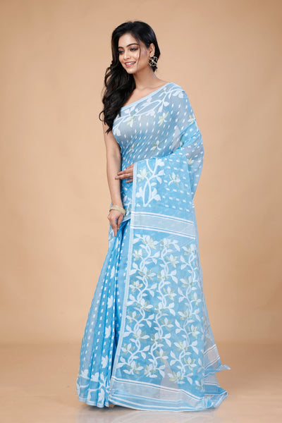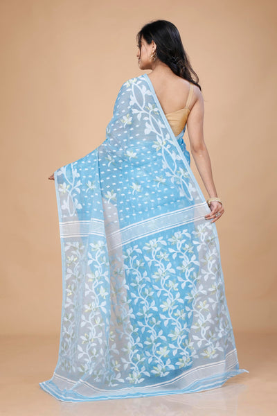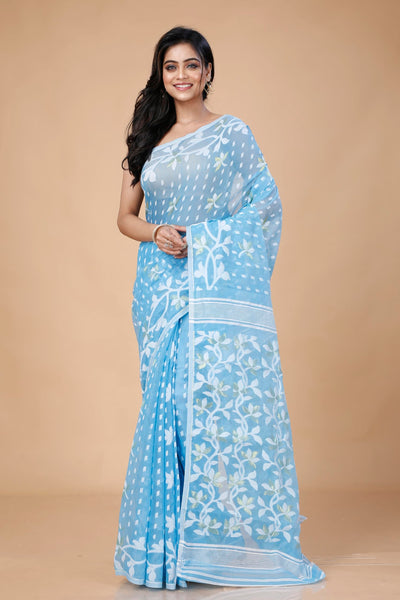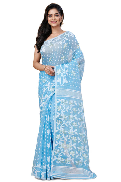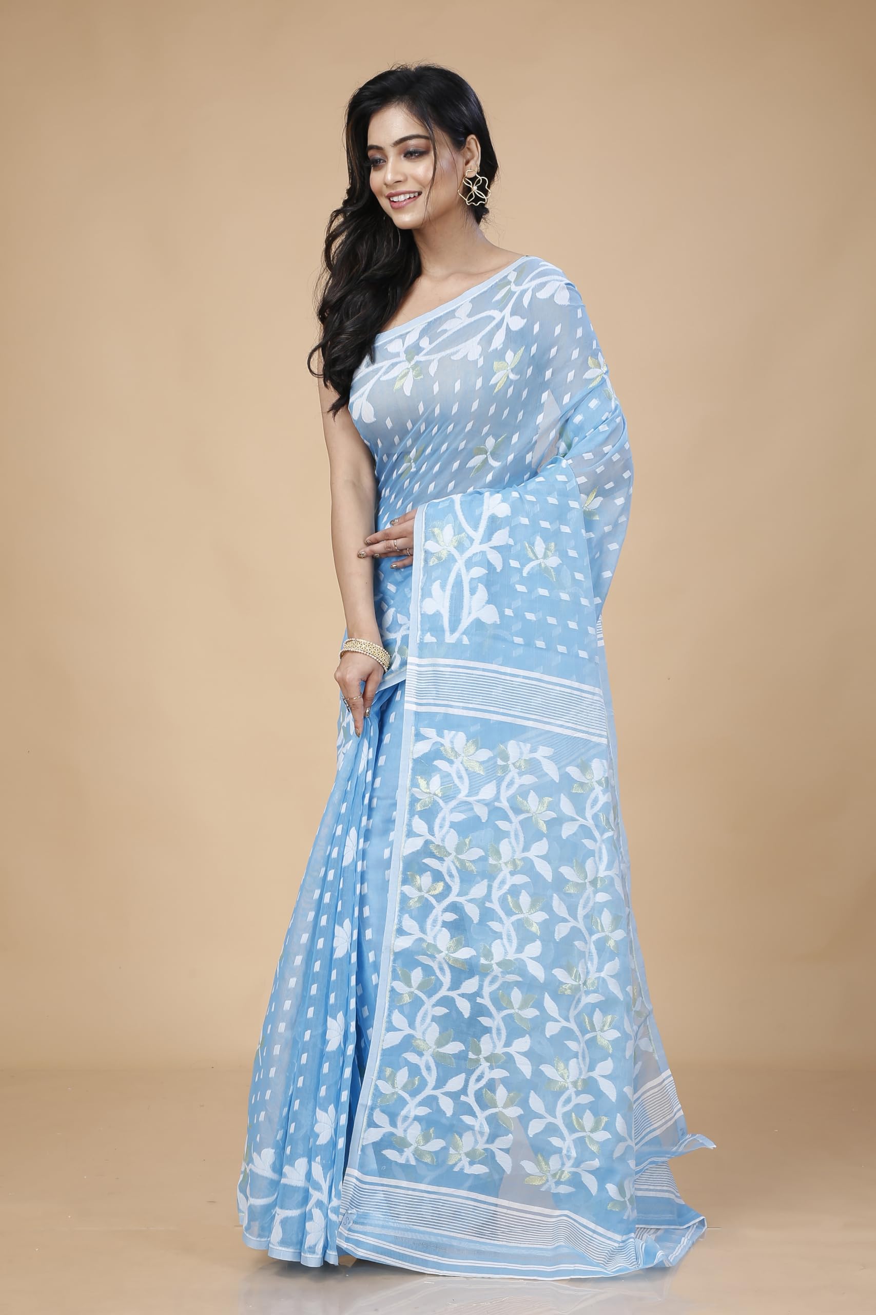 OISHANI SAREE GHOR Women's Traditional Bengal Cotton Silk Belpata Jamdani Saree (Sky Blue)