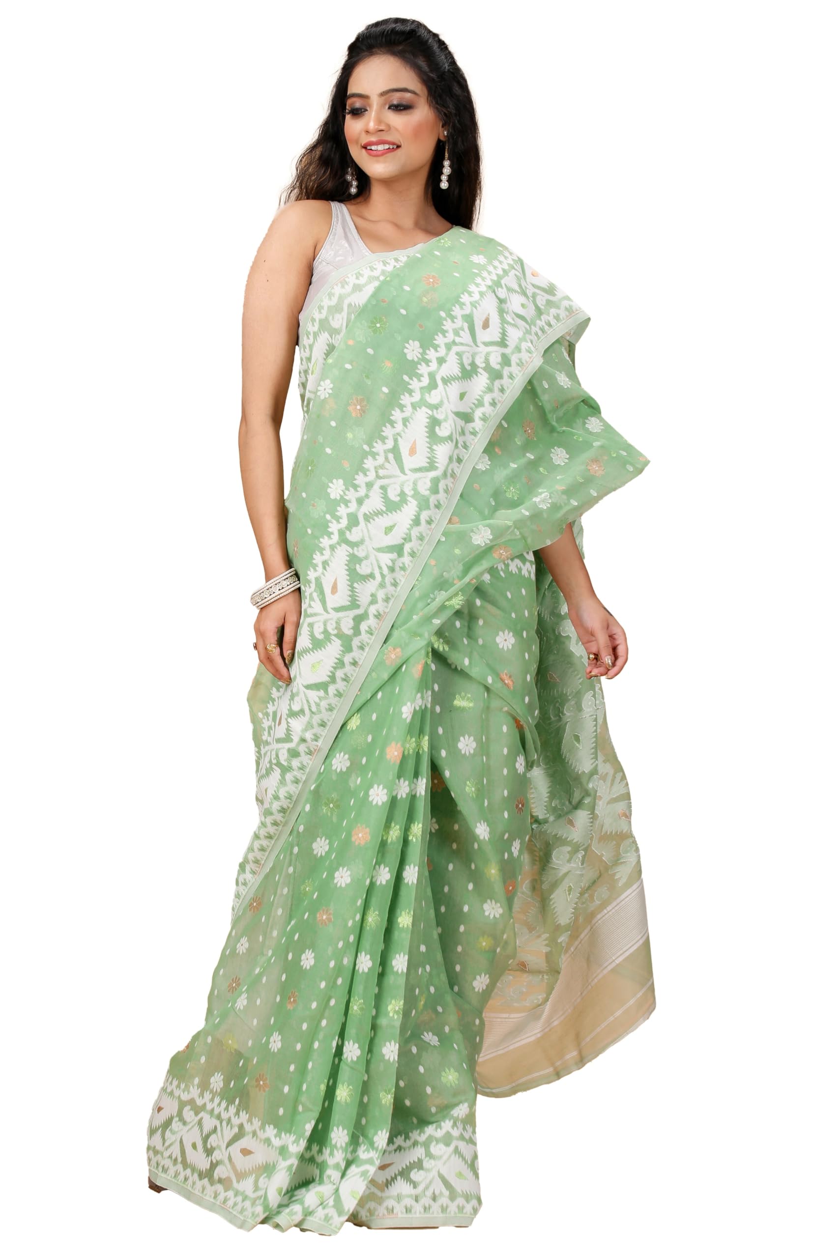 OISHANI SAREE GHOR Women's Traditional Bengal Cotton Silk Soft Jamdani Saree - Beautiful design and Quality - Without Blouse Piece (Mint Green)
