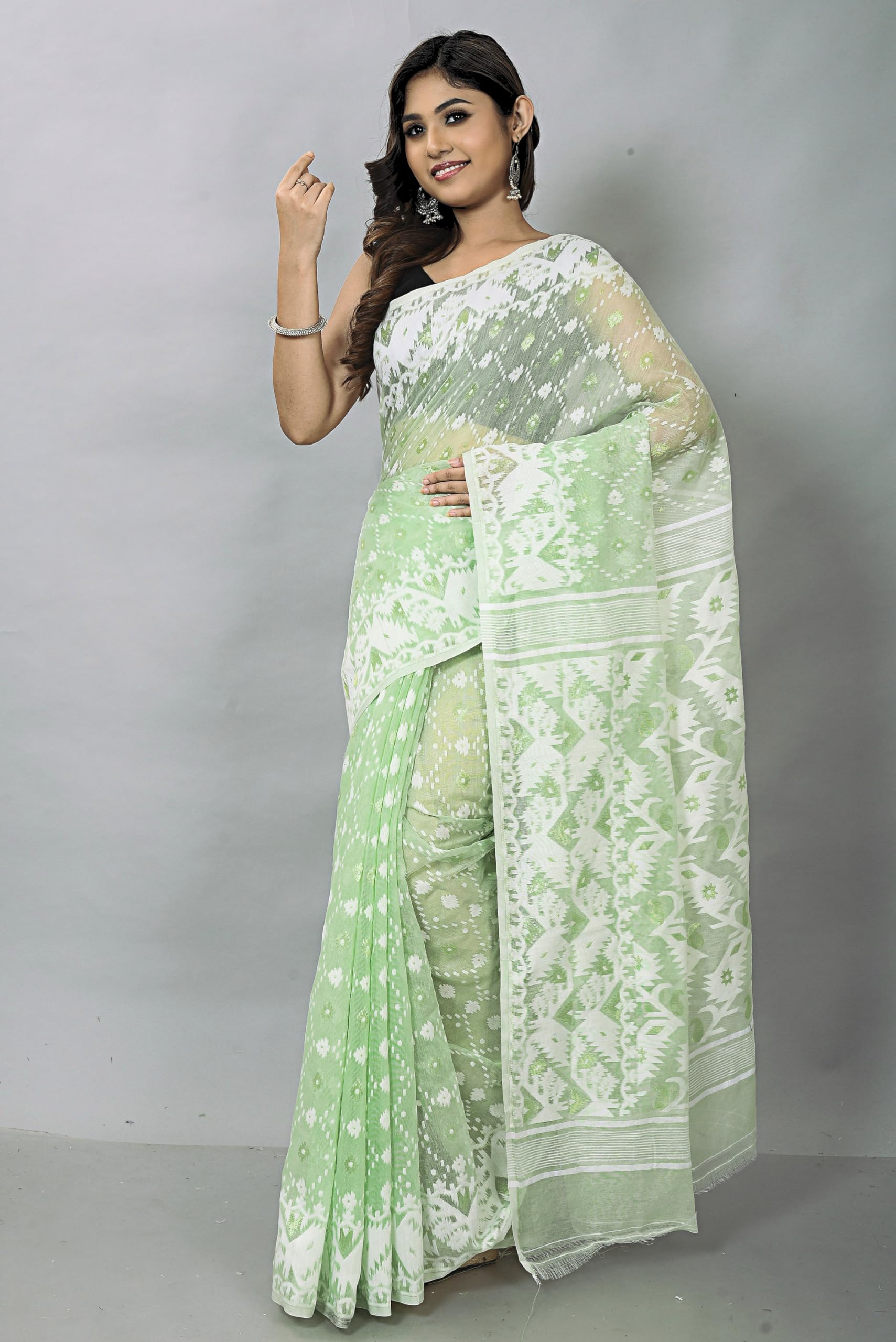 OISHANI SAREE GHOR Women's Traditional Bengal Cotton Silk Soft Jamdani Sarees (Off Green)