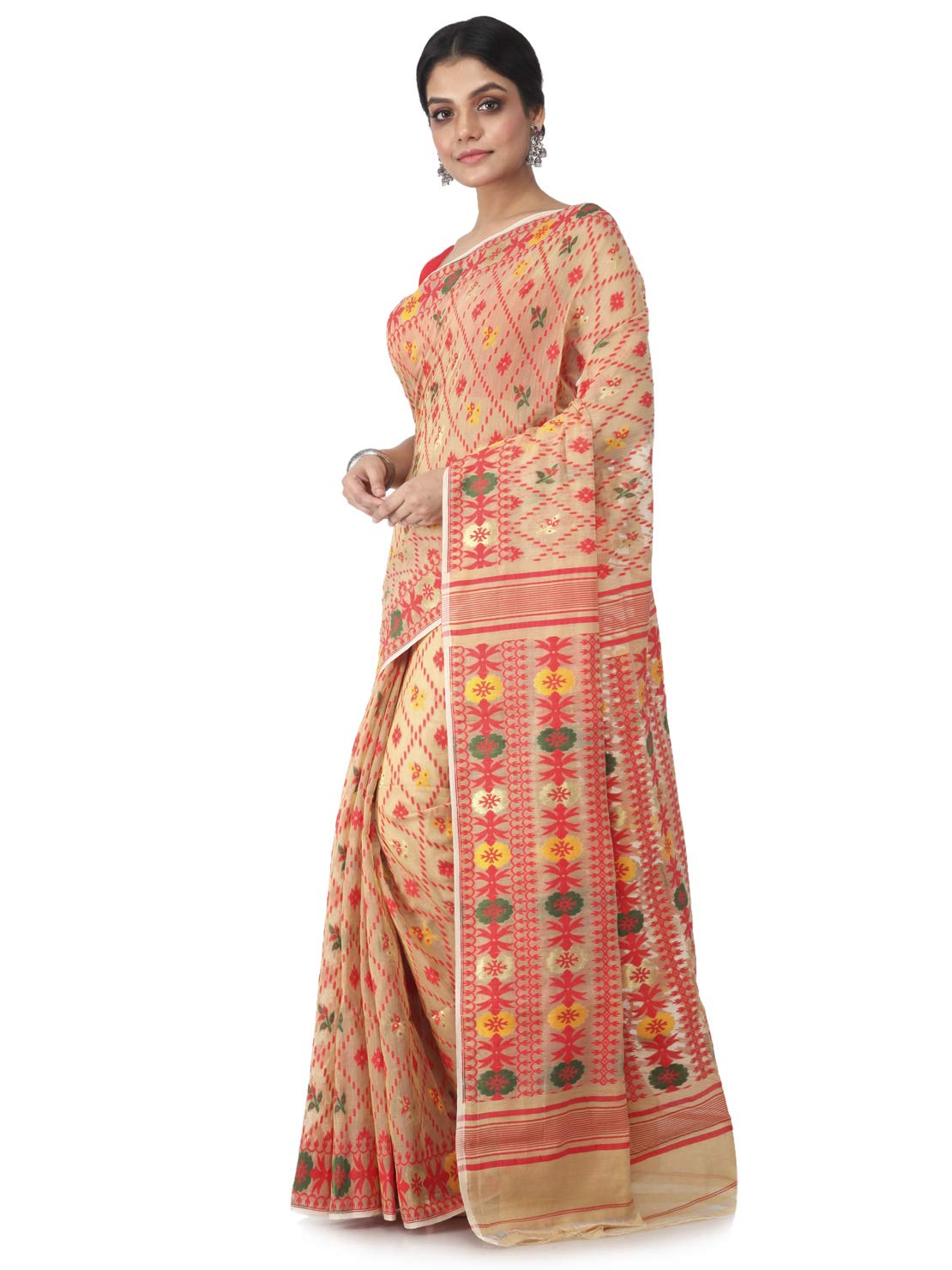 PinkLoom Women's Soft Cotton Jamdani Saree Without Blouse Piece, Beige, Gb156