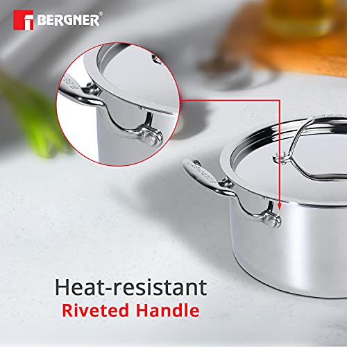 Details: Enjoy the art of cooking with Bergner Argent TriPly Stainless Steel Casserole! It is great to cook with as well as to serve food with Bergner Argent TriPly Stainless Steel Casserole. It looks super stylish on the dining table, works super efficiently on an induction or gas stove. It is made of tri-ply stainless steel, which transfers heat and spreads it quickly, evenly, and precisely throughout the cookware, all the way to the rim, preventing hot spots and resulting in an evenly cooked healthy meal. What is the tri-ply technology in Bergner Cookware? When a layer of aluminum is sandwiched between the two stainless steel layers of the cookware it is known as tri-ply technology. Here, the inner body is made of 18/10 stainless steel to facilitate minimum oil healthy cooking and also assures to be non-rustic, the middle part/second layer consists of edge to edge aluminum sheet for even heat distribution, the third layer is made of 18/0 stainless steel for induction compatibility. Moreover, the tri-ply technology contributes to 2X faster heating. Argent 3-Ply Cookware sets the new standard of rapid induction. Key Features: Stay cool cast handles - Offers durability and greater safety and convenience. Food-Grade Stainless Steel - Constructed using high-quality food-grade material. Flared Rim - Enables easy dripless pouring. 360° Induction Compatibility - Allows greater contact with the heat source and a much faster cooking time, it saves 30% energy. Compatibility: Compatible with induction, gas, halogen, electric, and vitro-ceramic. Stainless Steel Lid: Enables faster cooking and helps in retaining moisture in the food. Long-lasting Glossy Exteriors with 18/0 Stainless Steel: Makes it durable and elegant Dishwasher Safe: The cookware is dishwasher safe which ensures easy cleaning. For any product-related information or queries after its delivery, contact us at 1800-121-2206
